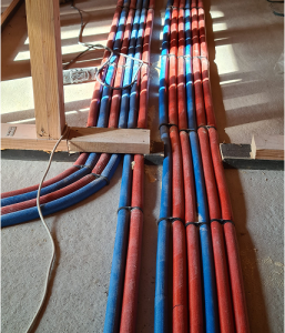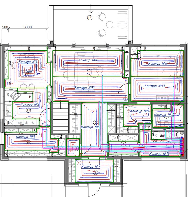 Для підвищення ефективності роботи теплового насоса збільшено площу опалювальних приладів. В будинку практично весь перший поверх обладнано водяною теплою підлогою, що підтримує комфортну температуру при зовнішніх морозах до -7 °C. При подальшому зниженні температури включаються додаткові джерела опалення — внутрішньопідлогові конвектори Hitte (у кімнатах з панорамними вікнами) та радіатори Kermi.